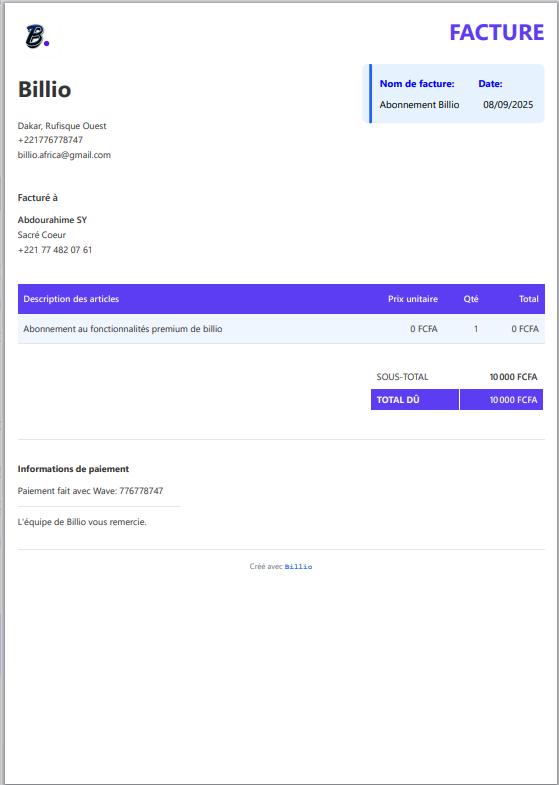 Billio est la solution de facturation en ligne conçue pour freelances et petites entreprises en Afrique.